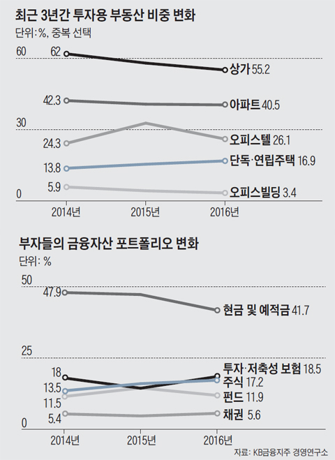 분석 결과에 따르면, 부자들이 보유한 투자 목적의 부동산 가운데 상가 비중은 2014년 62%에서 2015년 58.1%, 2016년 55.2%로 2년 연속 감소했다. 같은 기간에 아파트(42.3→40.8→40.5%) 비중과 오피스빌딩(5.9→4.3→3.4%) 비중도 역시 2년간 감소했다.